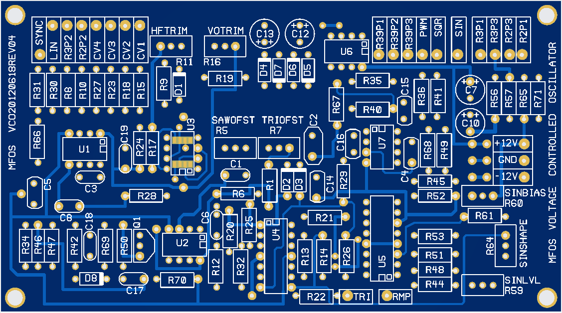 A bare PCB for the MFOS Voltage Controlled Oscillator which allows use of SOIC or DIP8 SSM2210 or SSM2212 dual NPN package or discrete matched NPN pair.