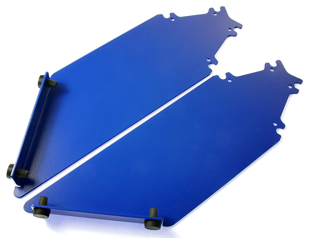 Fitted with grippy rubber feet to limit any sliding on the table. The second row case is further inclined by a fixed 45 degrees to the base case (total 67.5 degrees to the table top). Beyond 2 cases, our range of couplers can be used to form various arrangements of case configurations but there are limits. It is important to keep the centre of gravity inside the leg couplers or you will lose stability. For example, the 4 row rack in the attached photos uses a 22.5 degree coupler to make it 90 degrees and a further 0 degree coupler for the upper most case.